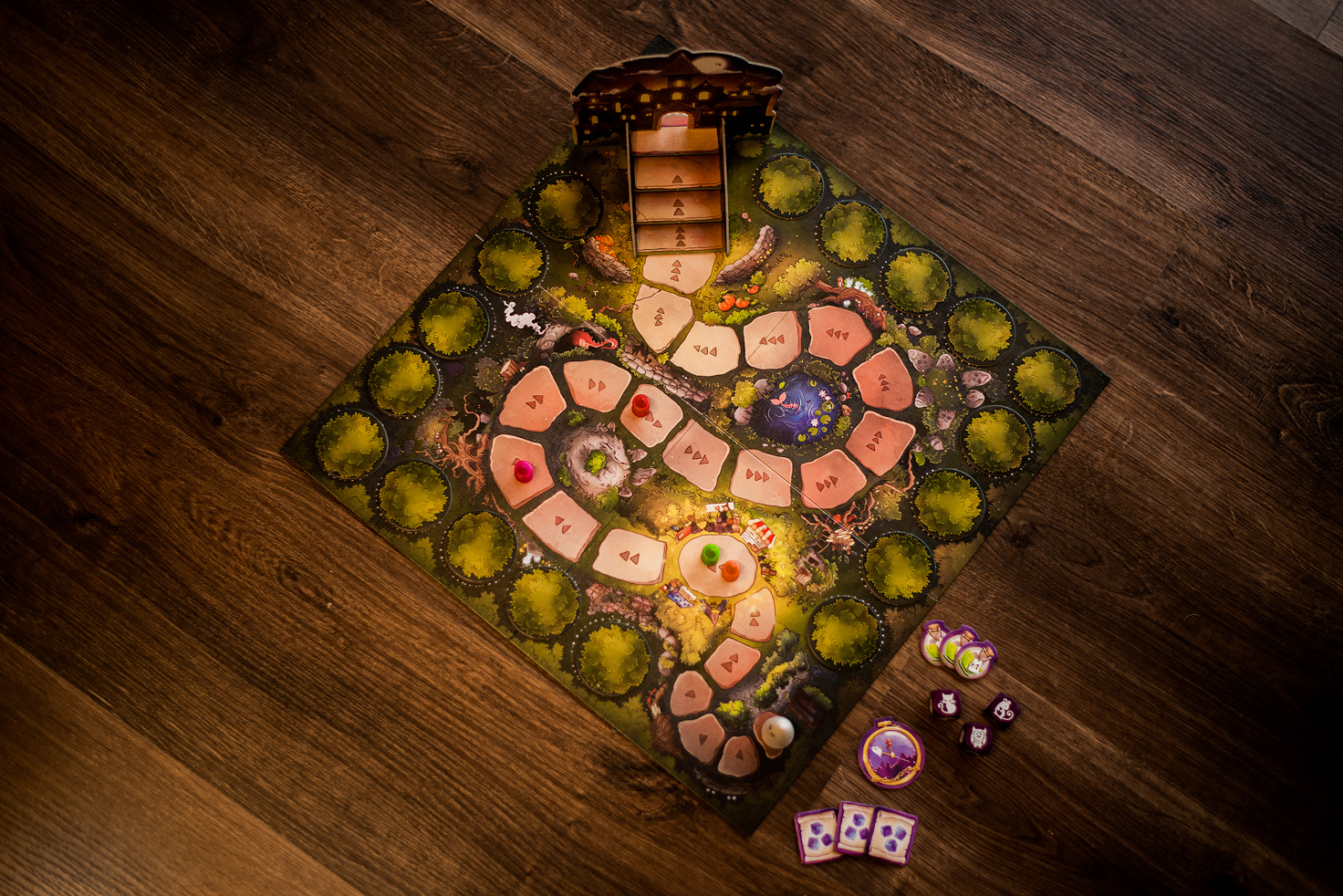 W pudełku znajdziemy planszę, szkołę magii, 6 pionków graczy, 1 duszka, 3 kostki, znacznik zegara, 18 kafelków drzew, 3 magiczne mikstury, 3 zaklęcia kości i instrukcję. Karton, z którego wykonana jest większość elementów (szkoła magii, plansza, znacznik zegara, kafelki drzew, magiczne mikstury i zaklęcia kości) jest gruby i sprawia wrażenie naprawdę trwałego. Pozostałe elementy (kości, pionki i duch) są zaś drewniane, więc o ich zniszczenie zupełnie nie trzeba się martwić.
